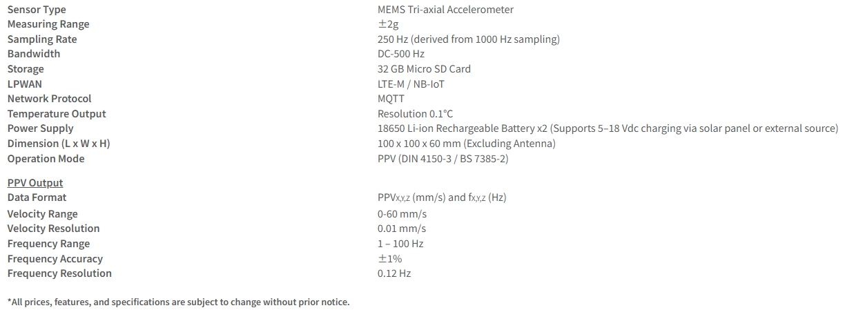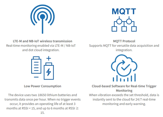 SHAKEdot is a vibration meter featuring LTE-M and NB-IoT wireless communication and provides tri-axial vibration and temperature measurements. It is powered by two 18650 lithium batteries and supports 5‒18 VDC charging, enabling long-term measurement, data logging, and upload to the dot Cloud web service. A built-in 32 GB microSD card provides sufficient storage capacity for over one million data records.