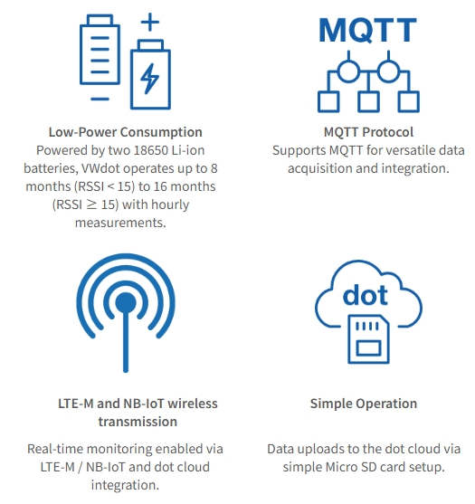The VWdot Vibrating Wire datalogger utilizes LTE-M and NB-IoT wireless transmission technology and is specially designed to meet the needs of geotechnical engineering applications. It is a reliable choice for automated safety monitoring in civil engineering, water conservancy, construction, and other fields.
